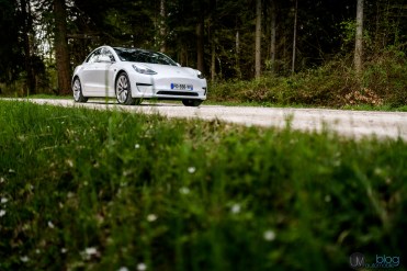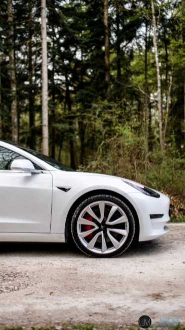 On va commencer par tourner autour. La Model 3 ne m’est pas inconnue et vous de même, puisque j’étais parti voir un des premiers exemplaires ayant atterri sur le sol français en décembre dernier. J’aurai le même avis que lorsque je l’ai vue la première fois : la Model 3 n’est peut-être pas un canon de beauté mais est très loin d’être laide. En d’autres termes, elle n’a pas l’élégance innée d’une Model S mais reste tout de même agréable à regarder. Peut-être qu’une ligne de toit un peu plus affûtée aurait apporté un peu plus de dynamisme au profil mais bon, il est trop tard pour revenir dessus. A part ça, les porte-à-faux quasi-inexistants, le capot court et bas et l’absence de calandre interrogent tout de même les passants : ils ont bien compris que cette voiture était différente des autres. Ah si, un dernier détail : la trappe occultant la prise de recharge se déploie automatiquement lorsqu’on la presse…ou lorsqu’on dirige un jet d’eau sous haute pression dessus. Attention dans les stations de lavage !