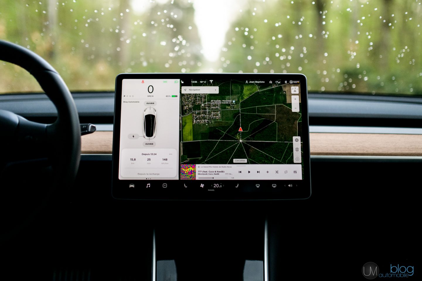 Des informations de conduite, d’abord. Pas de problème : vitesse, powermètre, odomètre, autonomie & co sont présents de façon continue sur le premier tiers vertical de l’écran. La clim ? Les sièges chauffants ? Accessibles tout le temps, en bas. Ensuite, ça va dépendre de ce que l’on fait. La carte Google Maps fait office d’écran d’accueil et il suffit d’un bouton pour lancer la navigation vers une adresse ou une station de charge. La musique est accessible d’une touche et peut se placer en raccourci en bas de l’écran. Le reste, moins utile et/ou plus pointilleux, se cache dans l’onglet représenté par la petite Model 3 de face. Qu’en retenir ? Que c’est globalement archi bien foutu. C’est ergonomique, bien pensé, et surtout ultra réactif.